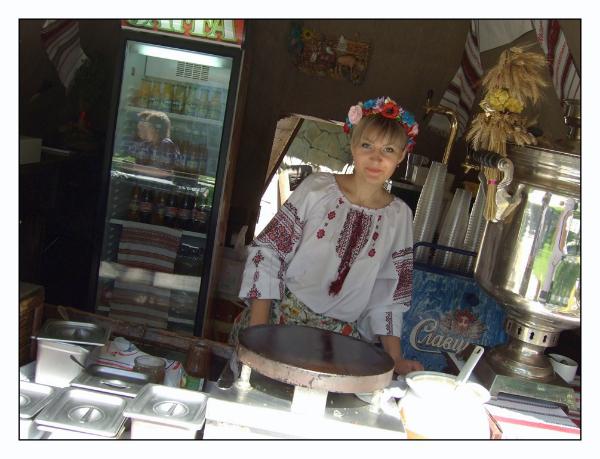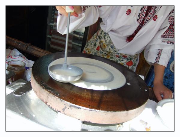goes, yes, my family, I am a copycat. The lady is making some crepe like things called Blini that are quite yummy. She puts