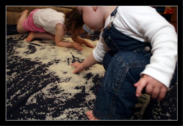 We have a big bucket of "play rice" that the kids get to play with. Cleaner than sand, to be sure, but it still makes a big mess.