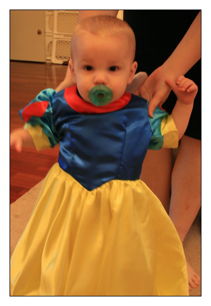Here, Chester is trying on Audrey's Snow White costume. A little bit out of focus, but I think it's a funny little picture!