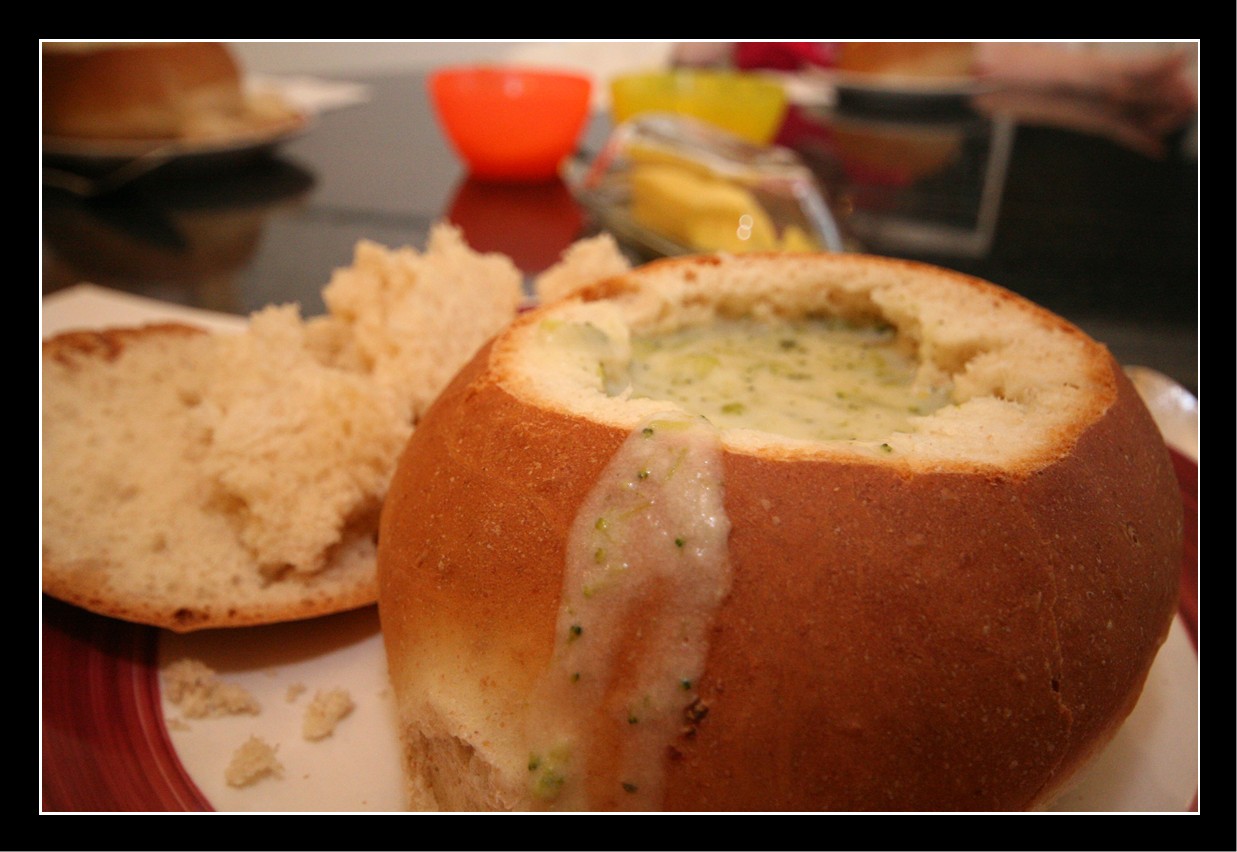 Laura made bread bowls and cream of broccoli soup for dinner tonight. This was the soup that made me fall in love with her, and I