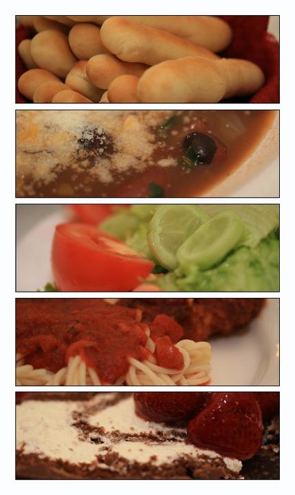 Pasta e figioli soup, green salad, chicken parmeasan with spaghetti, and a chocolate cake roll with strawberries for dessert. I was