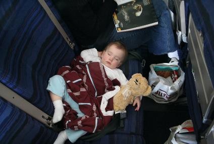 | "Our Weary Little Globetrotter" Asleep on the flight. Poor thing has been on 19 flights in her life. No wonder she was tired! |