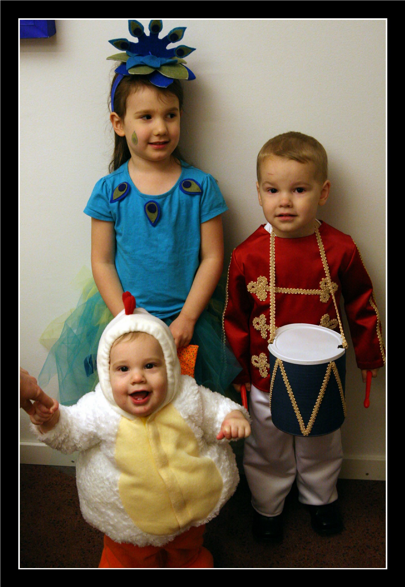 Audrey's and Chester's costumes this year. Audrey is a peacock, and Chester is a marching band guy with a drum (inspired not by